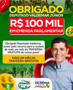 Já o deputado estadual Valdemar Júnior atendeu à solicitação do prefeito e destinou R$ 100 mil para garantir mais um mês de travessia gratuita entre Aguiarnópolis (TO) e Estreito (MA), medida necessária após o desabamento da Ponte JK, em dezembro do ano passado.