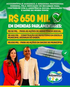 A senadora Professora Dorinha confirmou a destinação de R$ 650 mil para o município. Desse total, R$ 400 mil serão utilizados para a construção do refeitório da Escola Degraus do Saber, fortalecendo a estrutura da educação local. Outros R$ 50 mil serão destinados a ações da assistência social, enquanto R$ 200 mil reforçarão os investimentos na área da saúde, beneficiando diretamente a população de Aguiarnópolis.