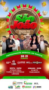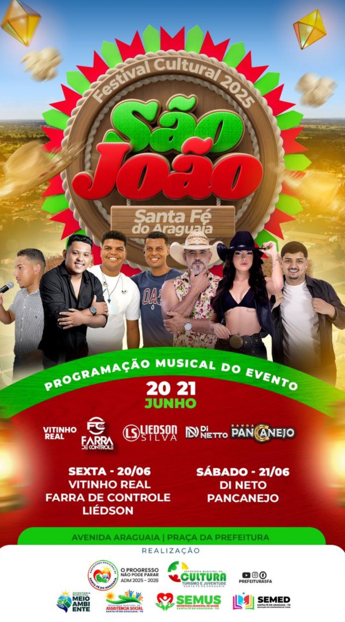 O clima junino já toma conta de Santa Fé do Araguaia. Nos dias 20 e 21 de junho, a cidade será palco de um dos eventos mais aguardados do ano: o Festival Cultural de São João 2025, que promete muita animação, tradição e música boa na Praça da Prefeitura, localizada na Avenida Araguaia.