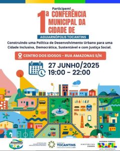 A Prefeitura de Aguiarnópolis, sob a gestão do prefeito Wanderly Leite, realiza nesta sexta-feira, 27 de junho, a 1ª Conferência Municipal da Cidade de Aguiarnópolis, com o objetivo de ouvir a população e construir, de forma participativa, soluções para o desenvolvimento urbano do município. O evento será realizado no Centro dos Idosos, na Rua Amazonas, das 19h às 22h.