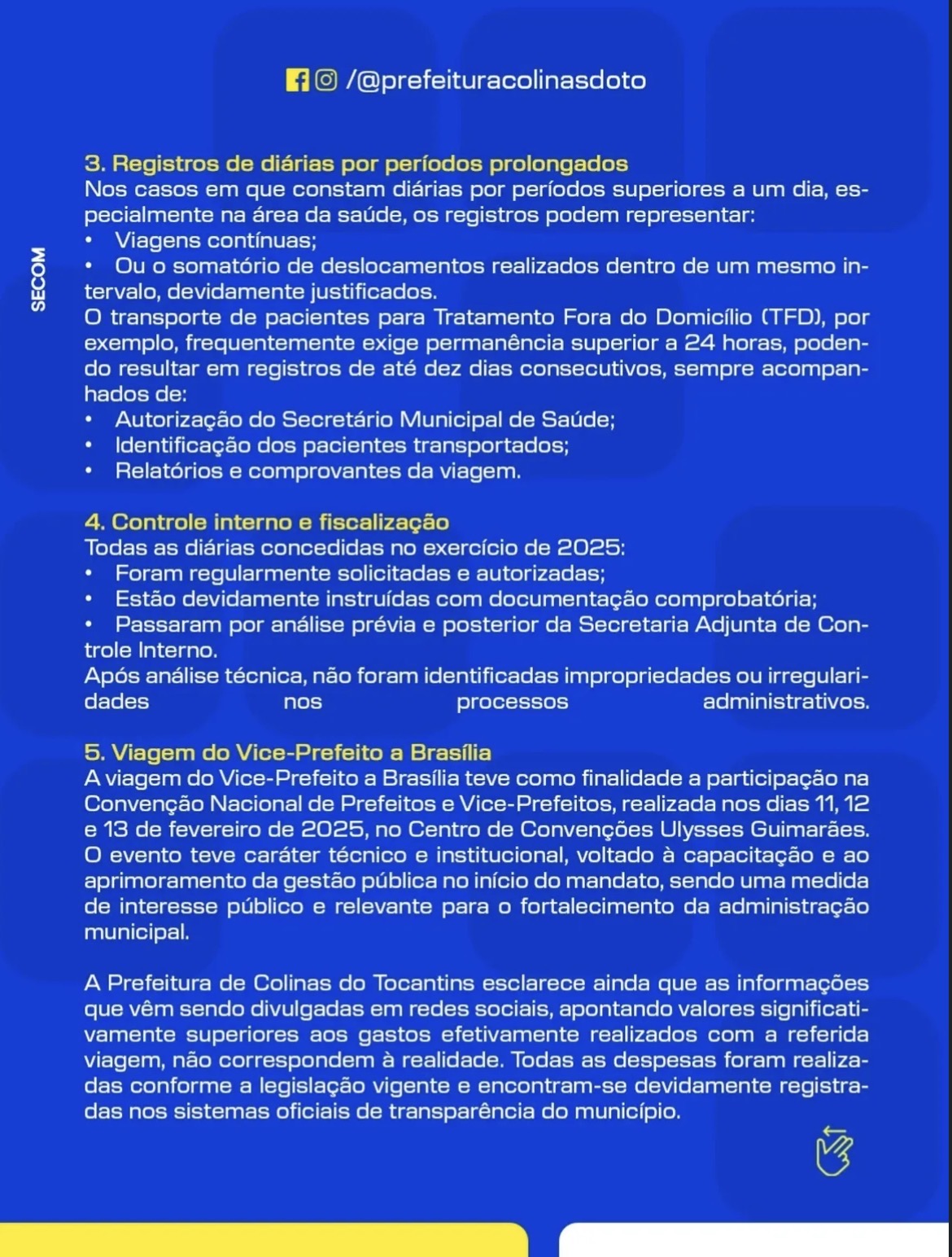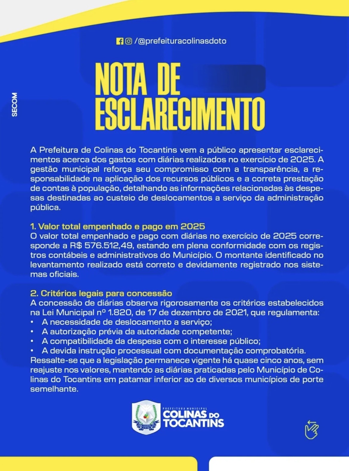 A Prefeitura de Colinas do Tocantins divulgou uma nota de esclarecimento para detalhar os gastos com diárias no exercício de 2025 e reforçar que todas as despesas seguem critérios legais e de controle administrativo.