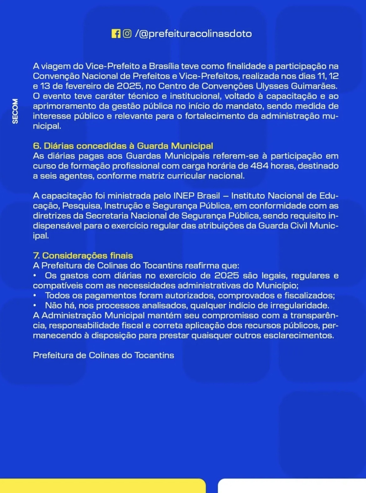 Ao final do comunicado, a Prefeitura de Colinas reforça que todas as despesas realizadas são legais, autorizadas e devidamente fiscalizadas, reiterando o compromisso da gestão com a transparência e com a correta aplicação dos recursos públicos.