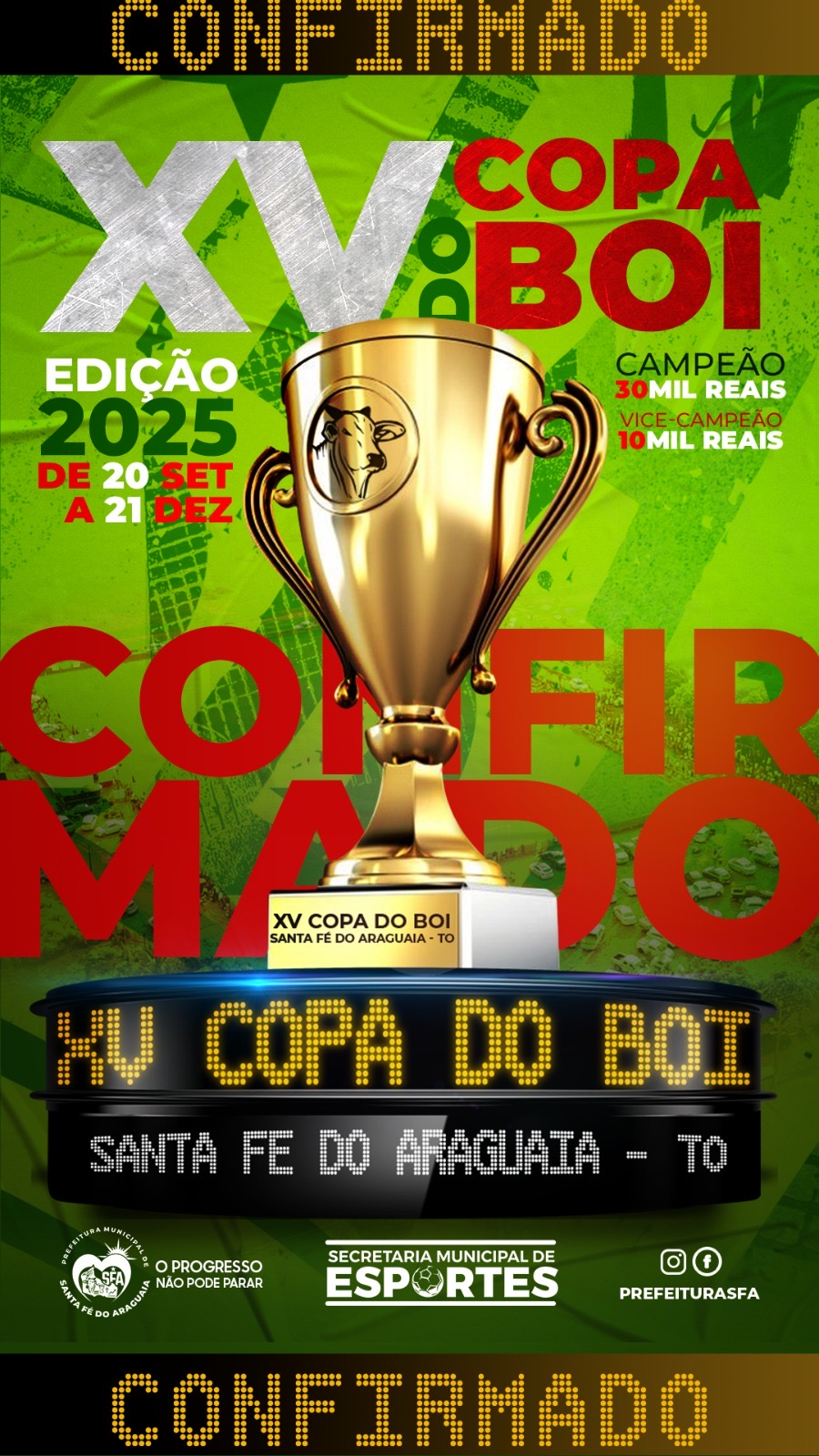 Santa Fé do Araguaia se prepara para uma das maiores edições da Copa do Boi, torneio tradicional que chega à sua 15ª edição com um marco inédito: R$ 40 mil em premiação, a maior da história da competição. A prefeita Vicença Lino confirmou o evento, que acontecerá entre 20 de setembro e 21 de dezembro de 2025, no Estádio Sebastião Chaves, e promete agitar o município e toda a região.