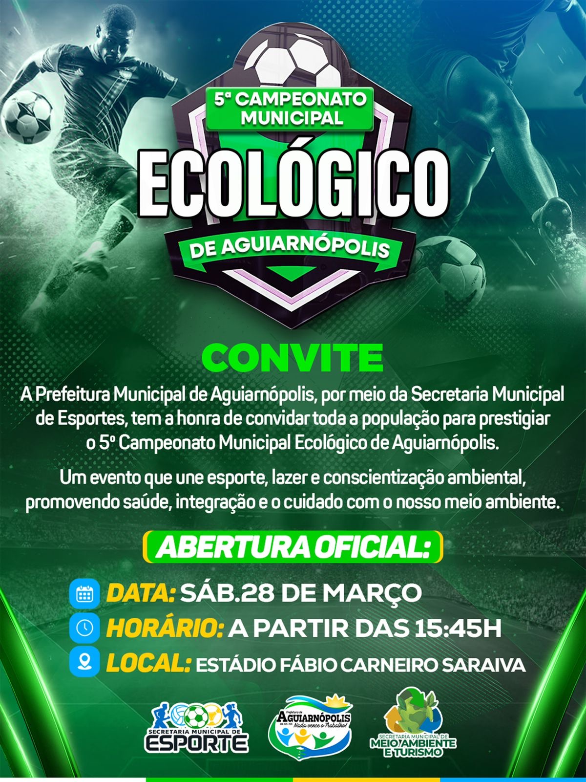 A gestão do prefeito Wanderly Leite segue fortalecendo o esporte como ferramenta de inclusão, saúde e integração social. A Prefeitura de Aguiarnópolis realiza o 5º Campeonato Municipal Ecológico, uma iniciativa que reúne esporte, lazer e conscientização, incentivando a participação da comunidade e valorizando os talentos locais.