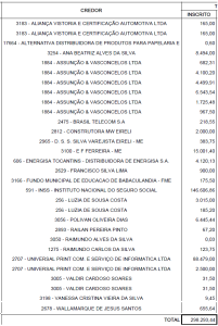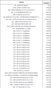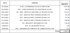 Os valores pendentes associados ao CNPJ da Prefeitura somam R$ 871.470,23. A lista de credores inclui empresas de autopeças, postos de combustível, precatórios do Tribunal de Justiça, prestadores de serviços diversos e dívidas com o INSS, que totalizam quase R$ 90 mil.