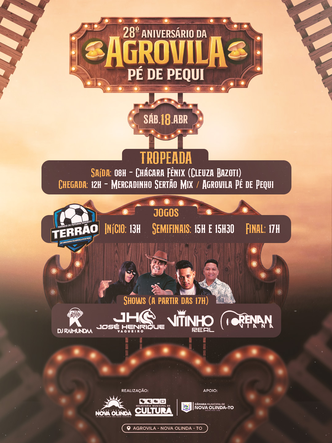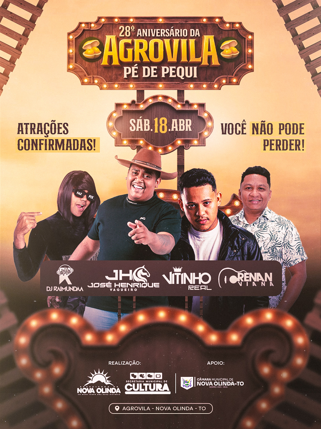 A Prefeitura de Nova Olinda, por meio da Secretaria Municipal de Cultura, com apoio da Câmara de Vereadores, prepara uma grande programação para celebrar os 28 anos da Agrovila Pé de Pequi, em um evento que promete reunir a comunidade em um dia inteiro de atividades, tradição e muito forró.